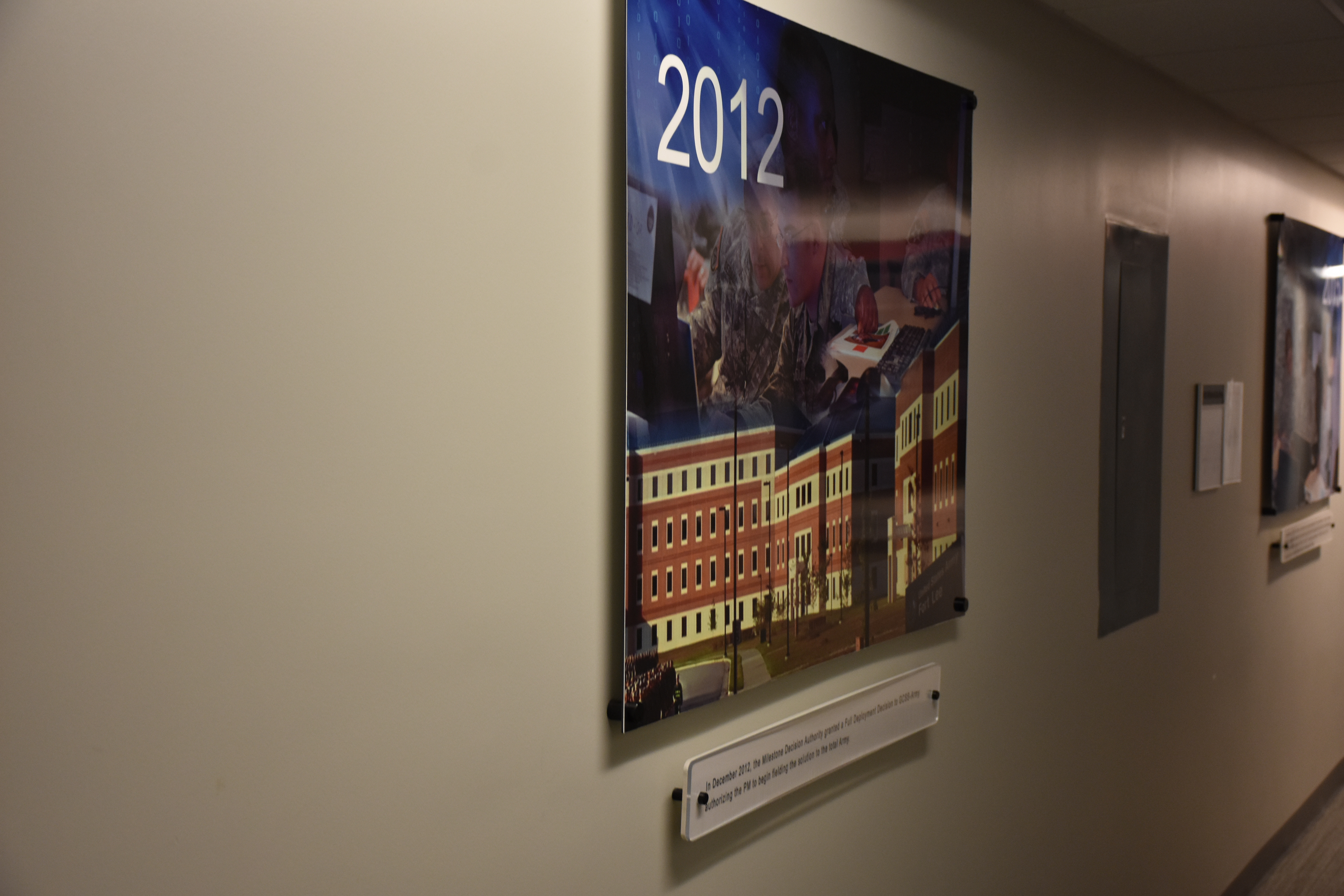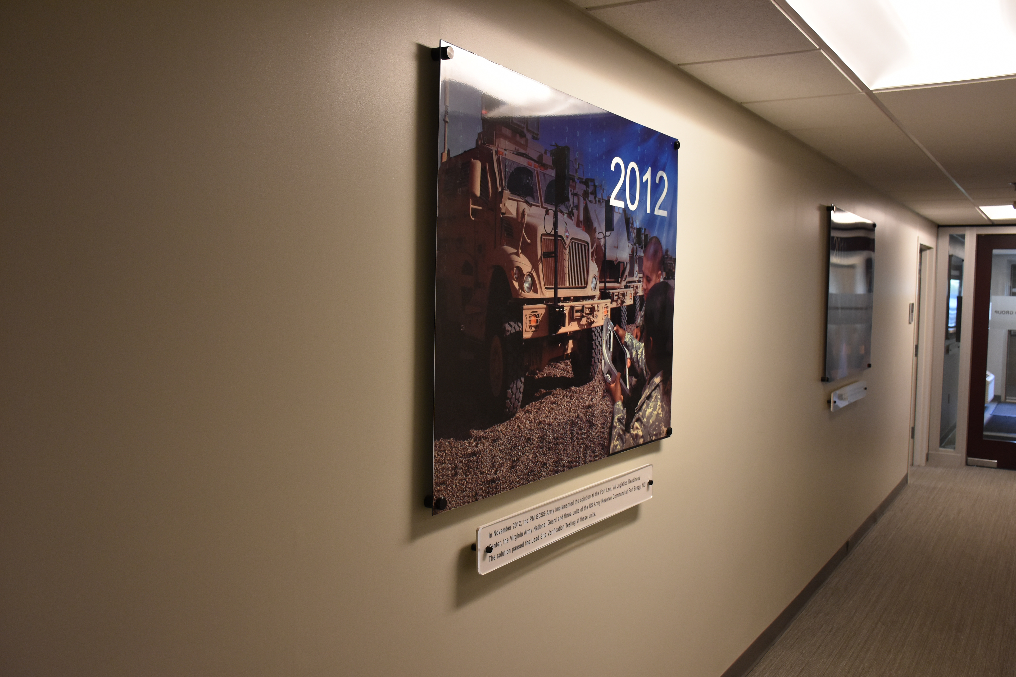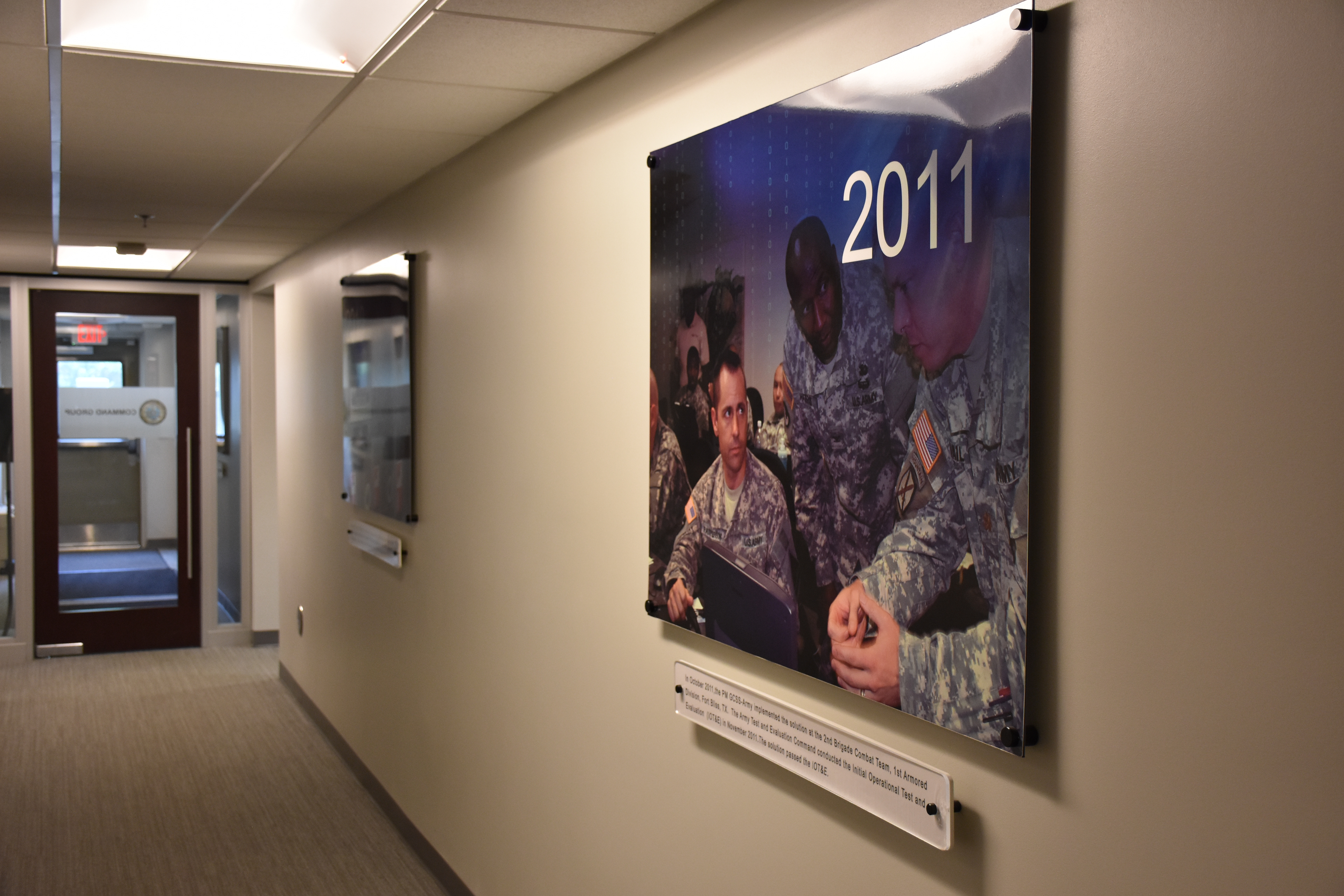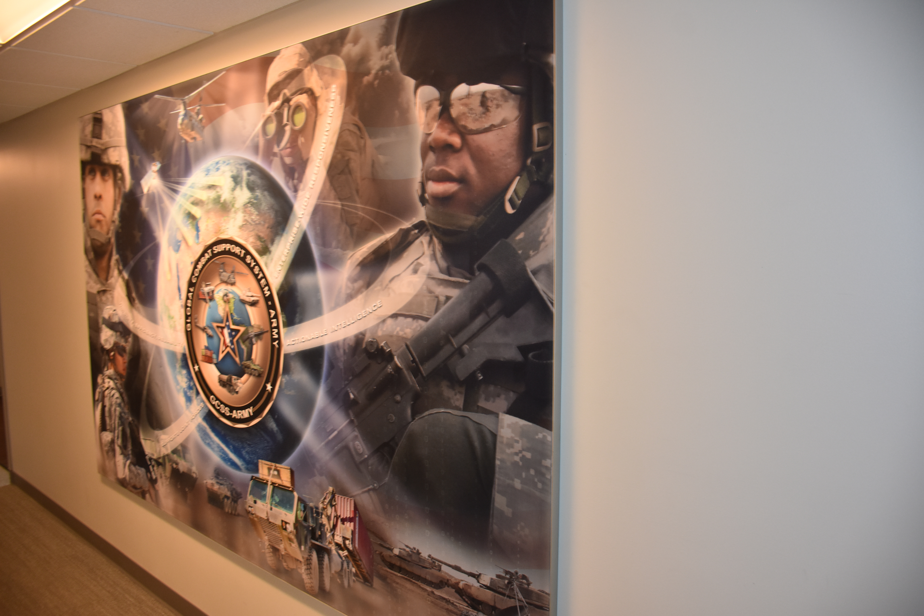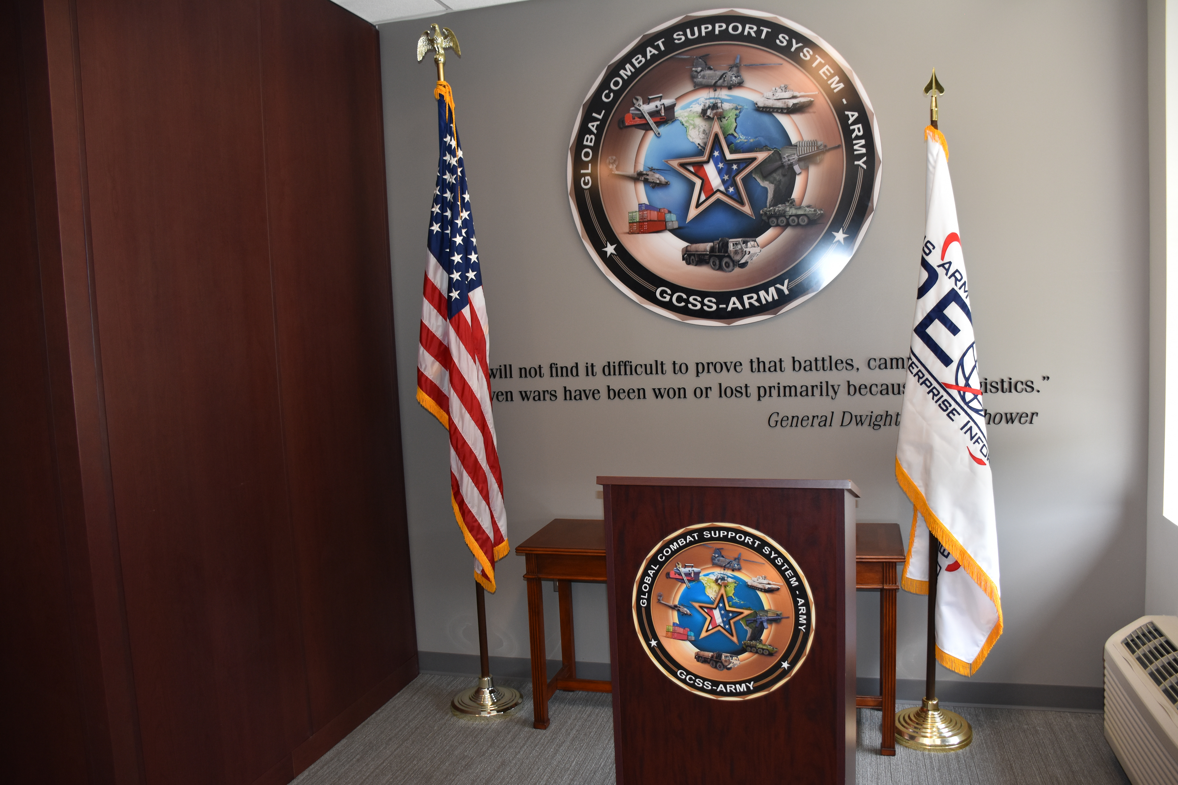 Complementing the logo, the interior wall designs transform the physical workspace into an engaging, branded environment. The walls feature large-scale graphics, including the GCSS-Army emblem, key system milestones, motivational statements, and visually compelling representations of the system’s global impact. These designs not only enhance the atmosphere but also reinforce the sense of purpose, unity, and innovation among Army personnel and stakeholders.